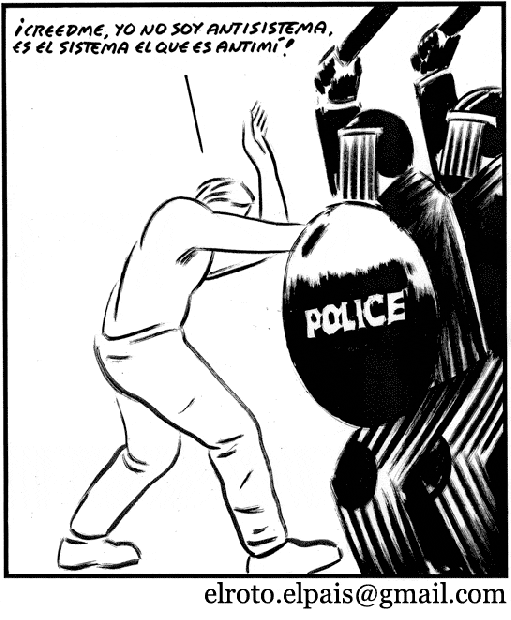 Note : El Roto est un pseudonyme. Il signifie en espagnol péninsulaire « l’accroc« , « la déchirure« . Par ailleurs, en Amérique latine, « un roto » désigne un homme du peuple, un ouvrier.
